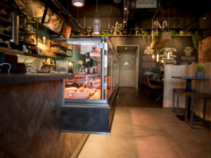 FOTO’S VAN HET PROJECTFAMILY APELDOORN IS DE NIEUWE HUISKAMER VAN DE BUURT Family Apeldoorn is een zaak die voelt als een warme deken. Sfeervol, gezellig en knus. Mensen voelen zich direct welkom en er zijn heerlijke hoekjes om rustig wat te komen eten. Het pand was in eerste instantie een grote uitdaging voor de ontwerpers omdat het een lange pijpen lade is met een kleine hoeveelheid daglicht. Het pand is ongeveer 35 meter diep en achterin heb je heel andere kwaliteiten als voorin. Gaandeweg is er gekozen voor een langsopstelling met een ruime keuken waarin ook de bezorging kan worden geprepareerd. Het succes van de zaak is vooral te danken aan de duidelijke routing en de uitstraling. Door een goede balans in afhaal en eethuis en ook nog de ruime uitgifte met veel geïntegreerde werkruimte is de sfeer en ambiance huiselijk en gemoedelijk. Er is veel contact tussen de werknemers en de klant en dat zorgt voor binding aan de zaak.